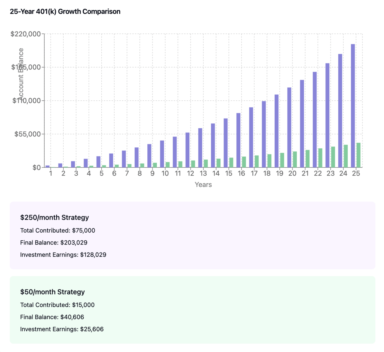 To illustrate this point, here’s what $50/mo vs $250/mo a month in retirement contributions (401k in this example) will return you over 25 years at a 7% growth rate.